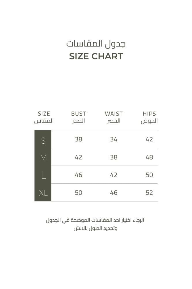 • ملحوظة: يرجى الاطلاع على الصورة الأخيرة لمزيد من التفاصيل حول محيط الصدر والخصر والحوض لكل مقاس.